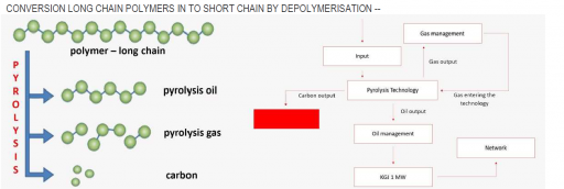 When the raw material is heated above the thermal stability of the present organic substances found in the raw material, there is a cleavage of the macromolecular matrix to a stable low molecular weight liquid and gaseous products, as well as a solid residue. Burning does not occur, as it would during the incineration of waste, meaning that depolymerization technology does not produce harmful emissions and has no negative impact on the environment.